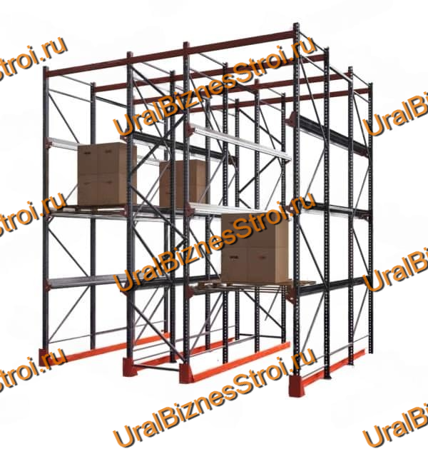 - Drive-through — конструкции с возможностью заезда с двух сторон, что позволяет работать по системе FIFO (первый пришёл — первый ушёл). Такой вариант удобен для хранения однотипного товара с ограниченным сроком годности.
